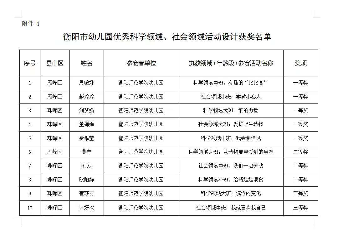 近日,2025年衡阳市幼儿园优秀科学领域、社会领域活动设计评选结果揭晓。我校幼儿园表现卓越,共有十项活动设计作品获奖,展现了该园在教学研究与实践创新方面的雄厚实力。