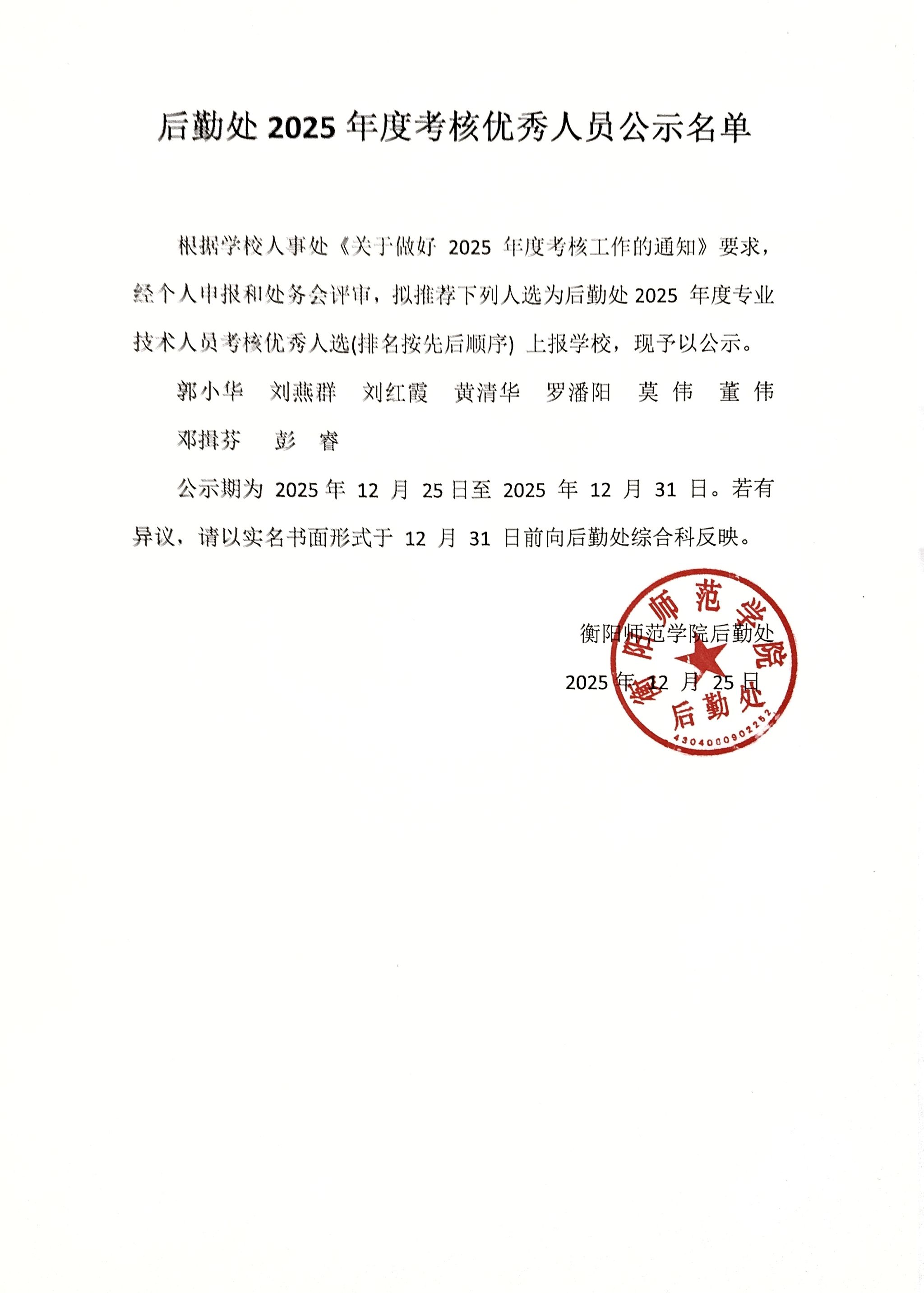 根据学校人事处《关于做好2025年度考核工作的通知》要求, 经个人申报和处务会评审,拟推荐下列人选为后勤处2025年度专业技术人员考核优秀人选(排名按先后顺序)上报学校,现予以公示。